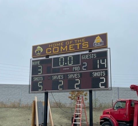 Catholic Central High School is lighting up the field in Windsor, ON with their brand-new Nevco Model 3680 Scoreboard, featuring crisp white LED digits for maximum visibility and impact. Adding a touch of school pride, a bold non-illuminated sign proudly displays: “Home of the Comets”, making it clear whose turf this is. With this eye-catching setup, the Comets are gameday ready like never before—bringing energy, excitement, and school spirit to every play!