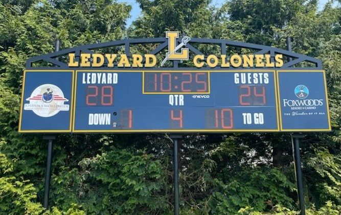 Nevco completed a custom scoreboard installation for Ledyard Youth League in Ledyard, Connecticut, delivering a strong visual focal point for the complex. The centerpiece of the project is a Model 3658 scoreboard finished in navy blue with yellow striping, a color combination that highlights league identity. The scoreboard displays red digits for clear game information and is accented by two ADO signage panels mounted along the sides, enhancing the overall presentation. Capping the installation is a decorative arch truss featuring the text “Ledyard Colonels” with the league’s logo prominently positioned at the center. This installation blends functionality with custom design elements, creating a distinctive and durable scoring display for Ledyard Youth League athletes and spectators.