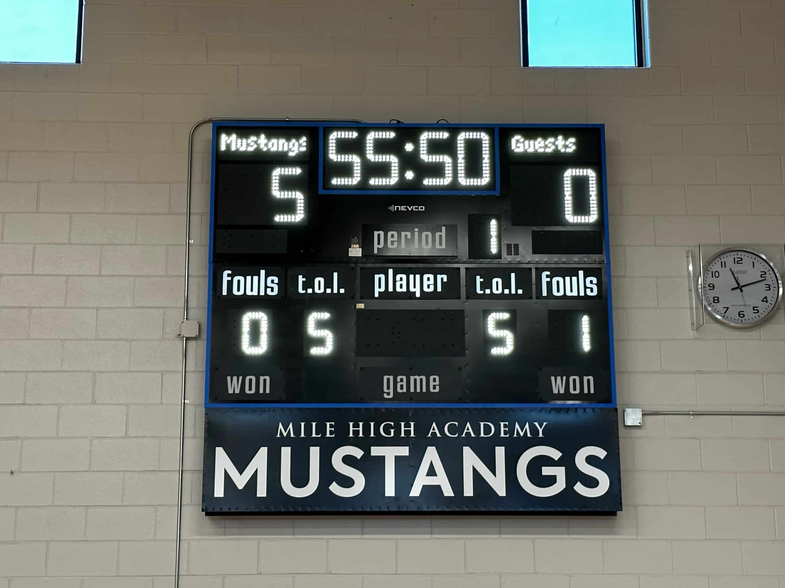 Mile High Academy located in Highlands Ranch, CO upgraded their indoor facilities with a Black Model 2770 Scoreboard with Electronic Team Names and White LED digits! The installation also features custom 1″ striping around the perimeter of the scoring solution. Included in the project, below the scoreboard is 2’H x 8’W Indoor (ADI) Signage proudly displaying “Mile High Academy Mustangs.”