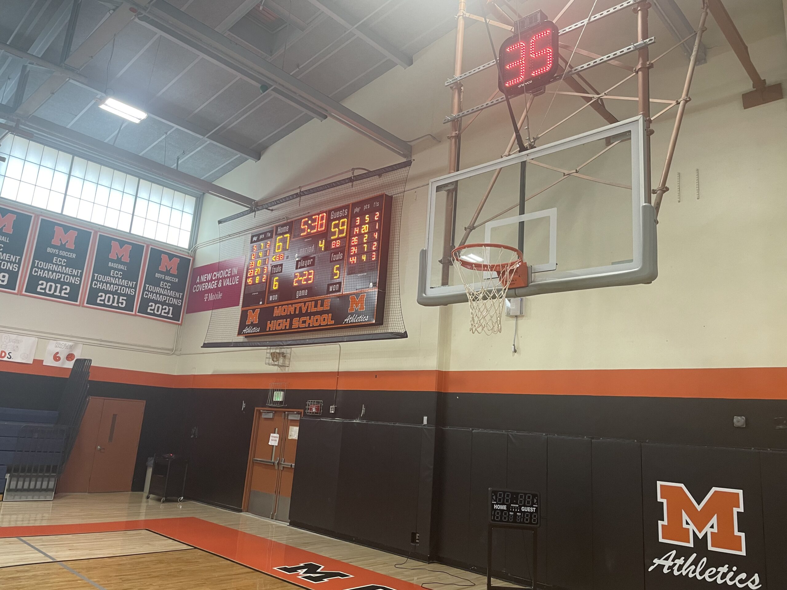 As part of a gymnasium enhancement project, Montville High School in Oakdale, Connecticut, partnered with Nevco to install a comprehensive basketball scoring system designed for visibility, durability, and game-day efficiency. The installation includes two Nevco Model 2750 scoreboards, finished in black with orange striping and amber digits for strong contrast. Each scoreboard is flanked by Model SD7-5 stat panels, providing clear statistical information for players, coaches, and fans. Mounted at the bottom of each scoreboard is a custom ADI signage panel reading “Montville High School,” accented with the school logo on both sides. A protective net is installed in front of the scoreboard to help safeguard the equipment, while an SSC-7 shot clock is displayed above the basketball backboard to complete the scoring setup. This Nevco installation delivers a polished, professional look while supporting the fast pace of high school basketball.