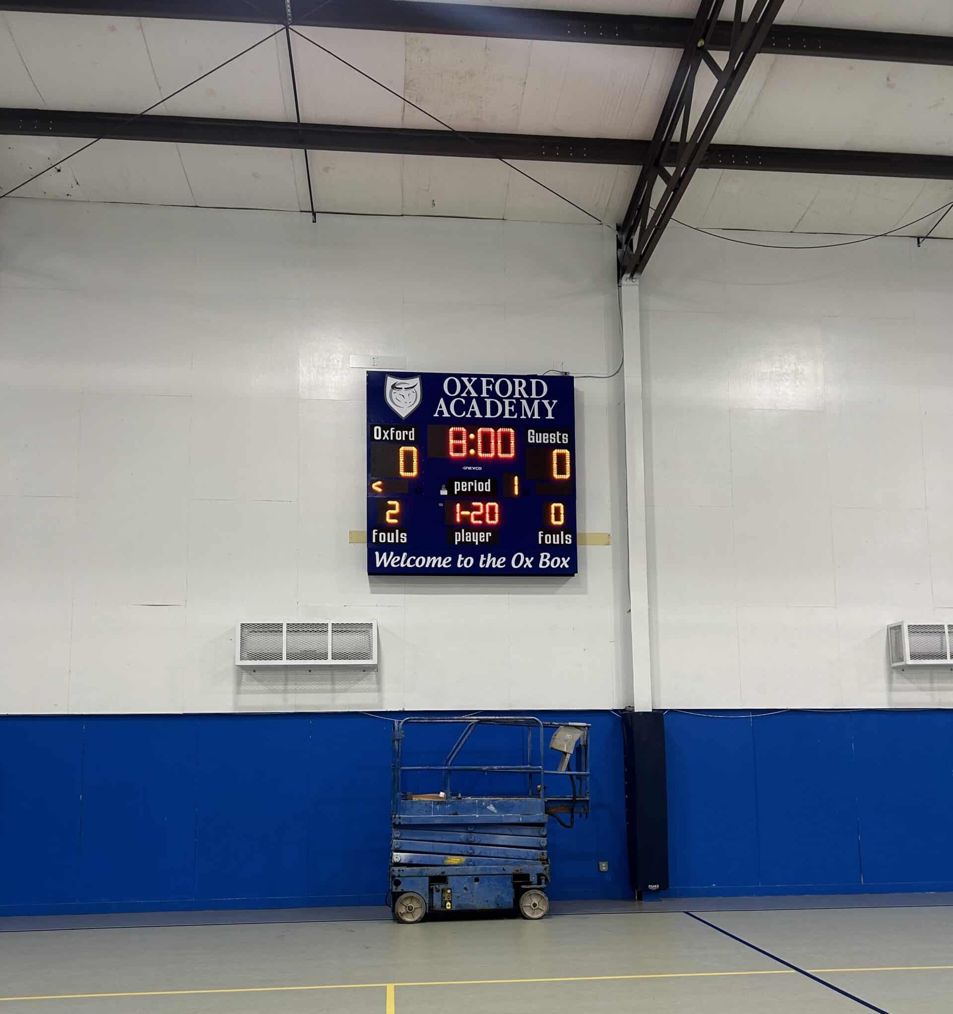 Nevco is proud to highlight the recent basketball scoreboard installation at Oxford Academy in Westbrook. This project features a Model 2710 (non-lit) Scoreboard finished in a bold Midnight Blue cabinet, creating a strong visual presence in the gymnasium while complementing the school’s branding. Framing the scoreboard are two custom ADI signage panels that enhance school pride and identity. The top panel proudly displays “Oxford Academy” alongside the school’s logo, while the bottom panel welcomes fans and athletes with the phrase “Welcome to the Ox Box.” Together, the scoreboard and custom signage create a clean, cohesive centerpiece for the court, delivering a professional look that elevates the game-day atmosphere for players and spectators alike.