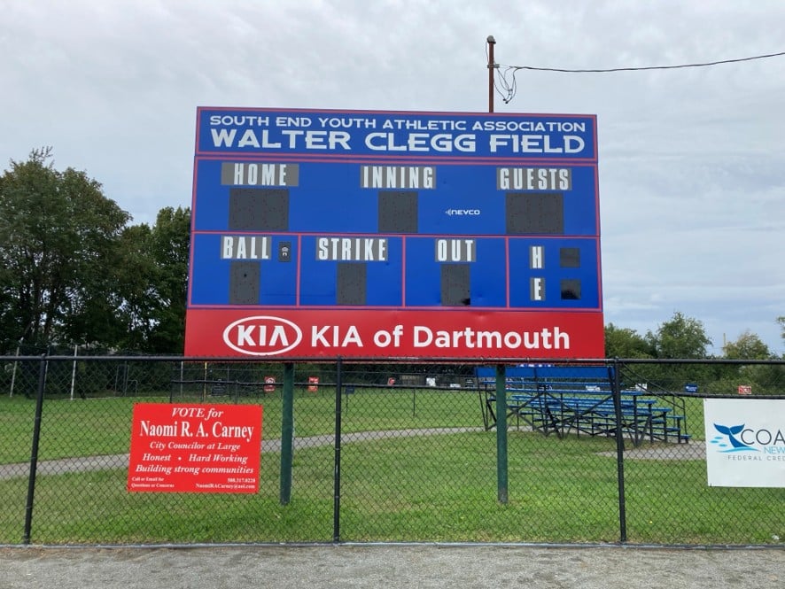 Nevco is proud to showcase our recent installation at the South End Youth Athletic League in New Bedford, MA. This project features a Model 1635 scoreboard finished in royal blue with bold red striping, creating a vibrant and professional look for Walter Clegg Field. The display is topped with custom ADO signage reading “South End Youth Athletic Association, Walter Clegg Field,” while a second ADO panel along the bottom highlights “KIA of Dartmouth,” recognizing a valued community sponsor. Designed as a complete baseball and softball scoring solution, the Model 1635 delivers clear, reliable game information for players, coaches, and fans, enhancing the game-day experience and celebrating community pride at every pitch.